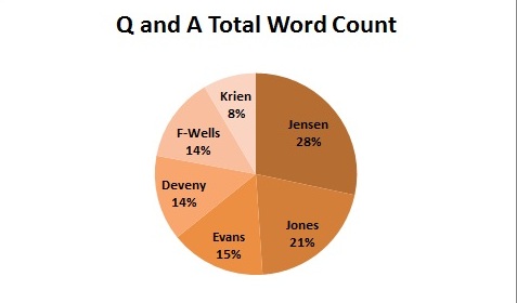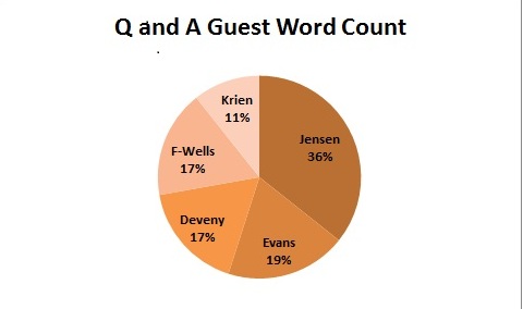 Not at all. In fact, Deveny was only asked to speak four times during the program (and once more by an audience member). Further, despite having been far less verbose than Jensen, Deveny was twice requested to ‘keep it brief’. In contrast, Jones asked Jensen to comment eight times (Krien and Wells, six and Evans, four).