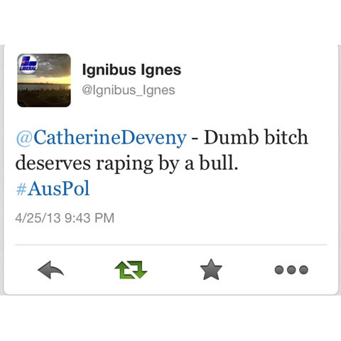 So there it is – it’s not a complete run-down of all those who threatened Deveny with rape, suggested she should kill herself, or simply took the time to tell her how ugly she is – but it’s the best I could do in a day. I’m sorry to all those people I didn’t get a chance to spotlight. Maybe next time.